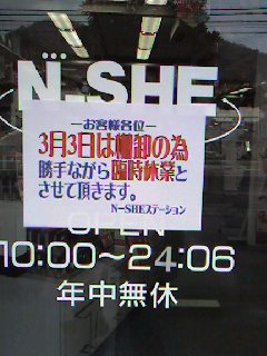 いや、予想していなかったわけじゃないけどね。3/3(月)というのはそんなに棚卸しに向いた日なんですかねぇ?帰る途中でふと横を見たコンビニ。さすがにここだけはトラックも入って、元気に活動中・・・・