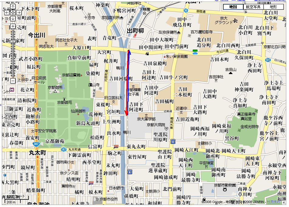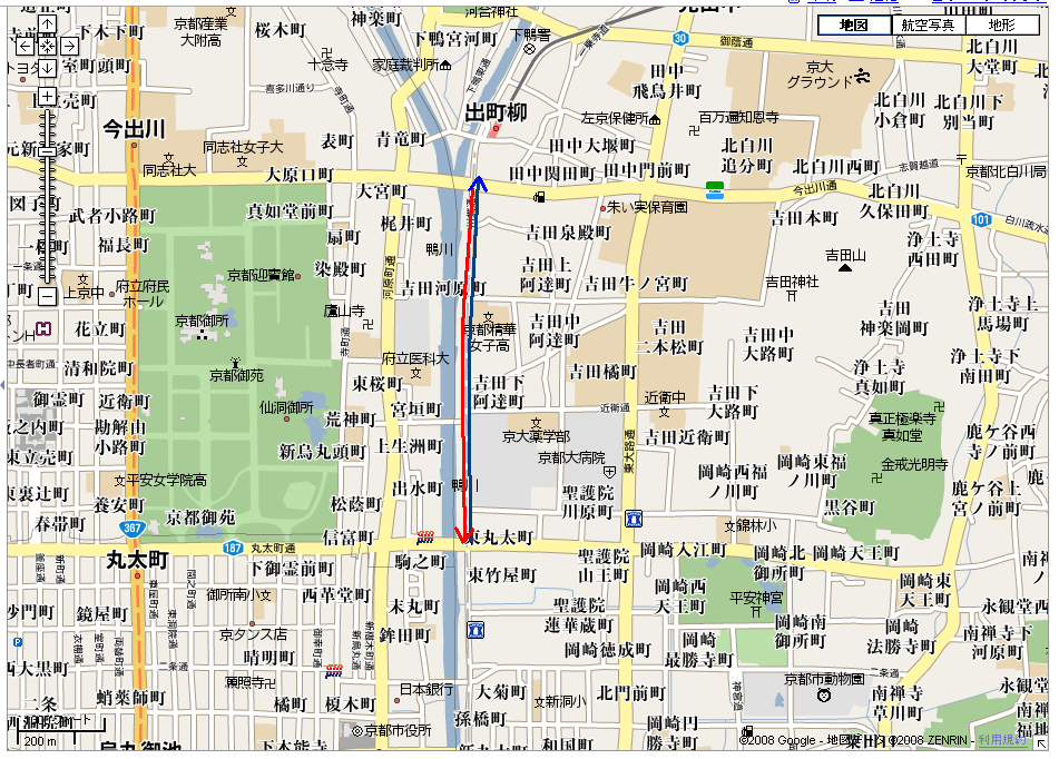 鴨川沿いに今出川通から河原町通まで。下宿までの距離も考えてちょうどこれで4km程度です。河原町ぐらいなら何とかいけるだろうと思って始めたのですが。