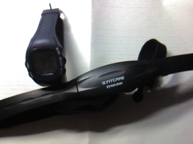 下の機械を腹に巻いて使用します。腹の機械から時計に電波を送り、時計側で処理して表示するようです。maruman FITCARE FC001。値段も6000円となかなか安い。