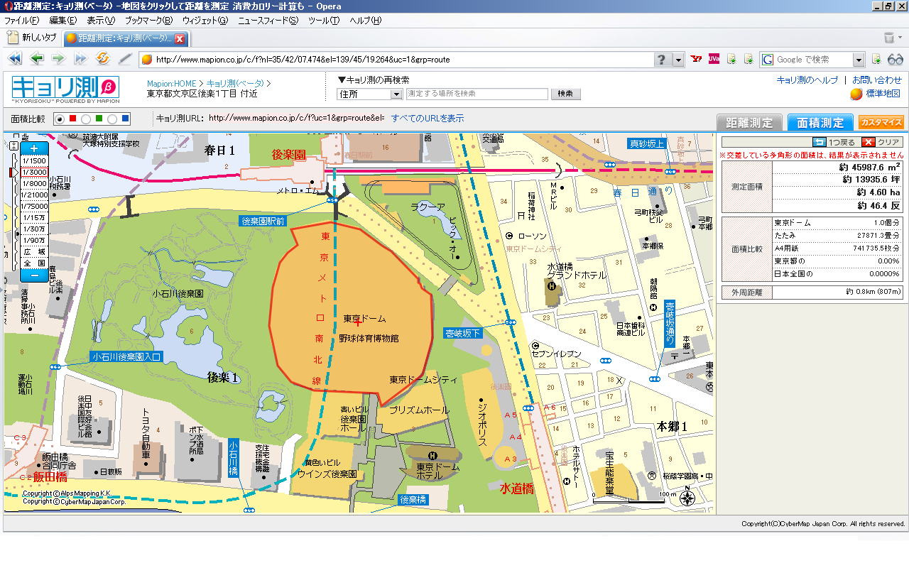 ・・・で、東京ドームの面積をこれで測って本当に「東京ドーム1.0個分」とでるかどうか調べようと考えるあたりひねくれてるのかな?w